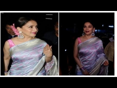 Madhurya Creations Sarees }}- Dhak Dhak girl Madhuri Dixit attended a wedding ceremony last night in Mumbai She donned a grey flamingo weave banarasi saree with a pair of enamel ...